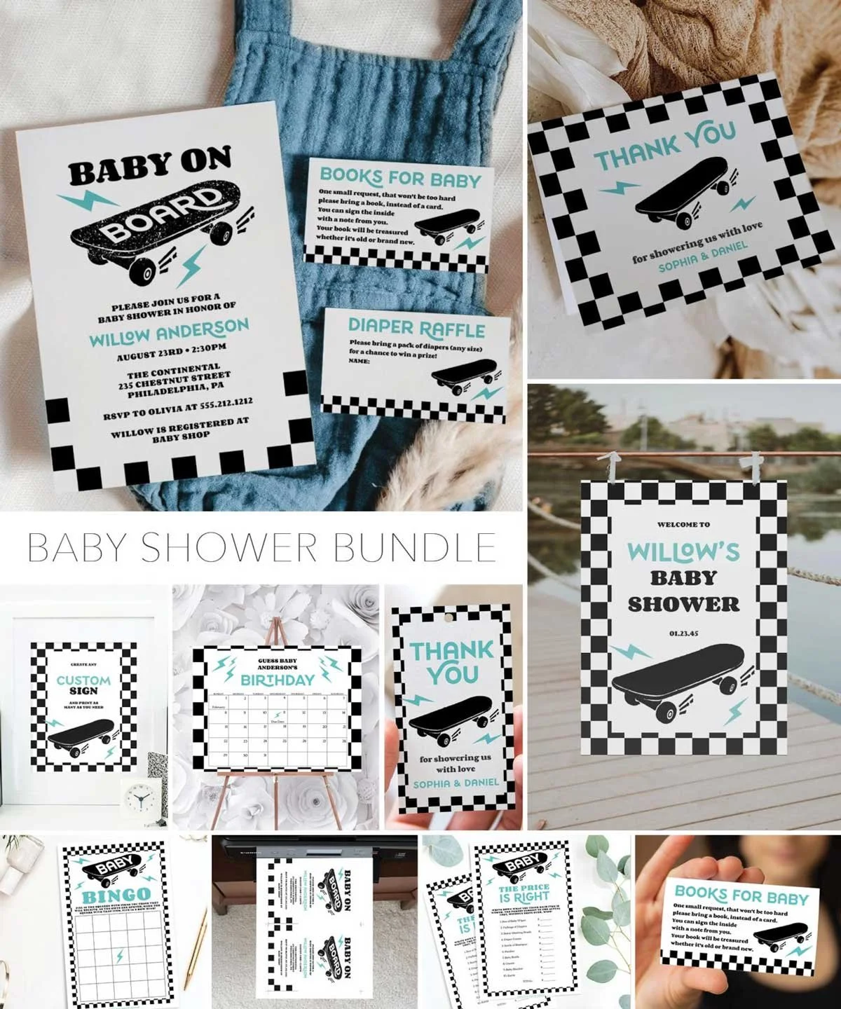 Get ready to take your baby shower to the next level with Creative Union Design’s super rad skateboard-themed baby shower bundle! Invite, thank you card, diaper raffle, and books for baby cards included! Easy to edit and print!