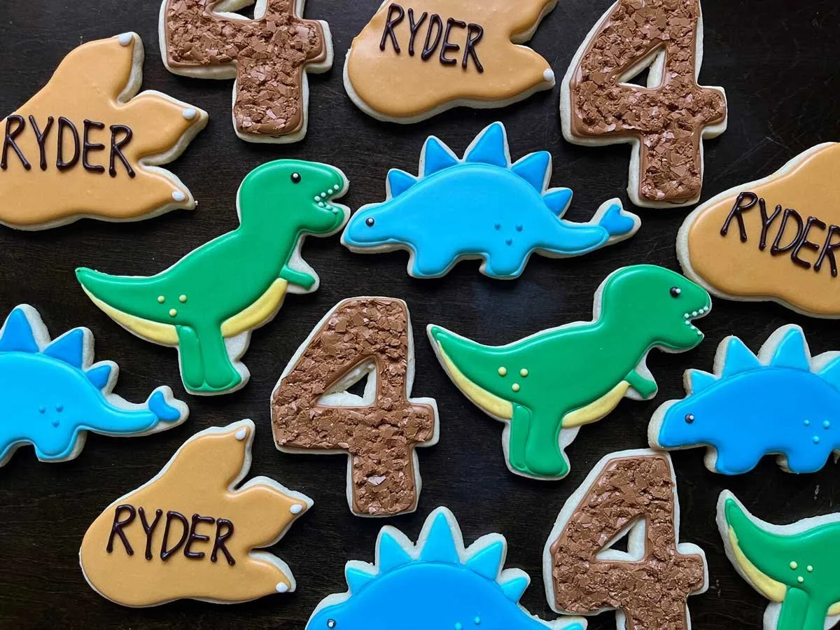 Sugar cookies decorated for a dino birthday! Set of one dozen includes twelve cookies in T-Rex, stegosaurus, footprint, and number shapes. Number and name on cookie are customizable.