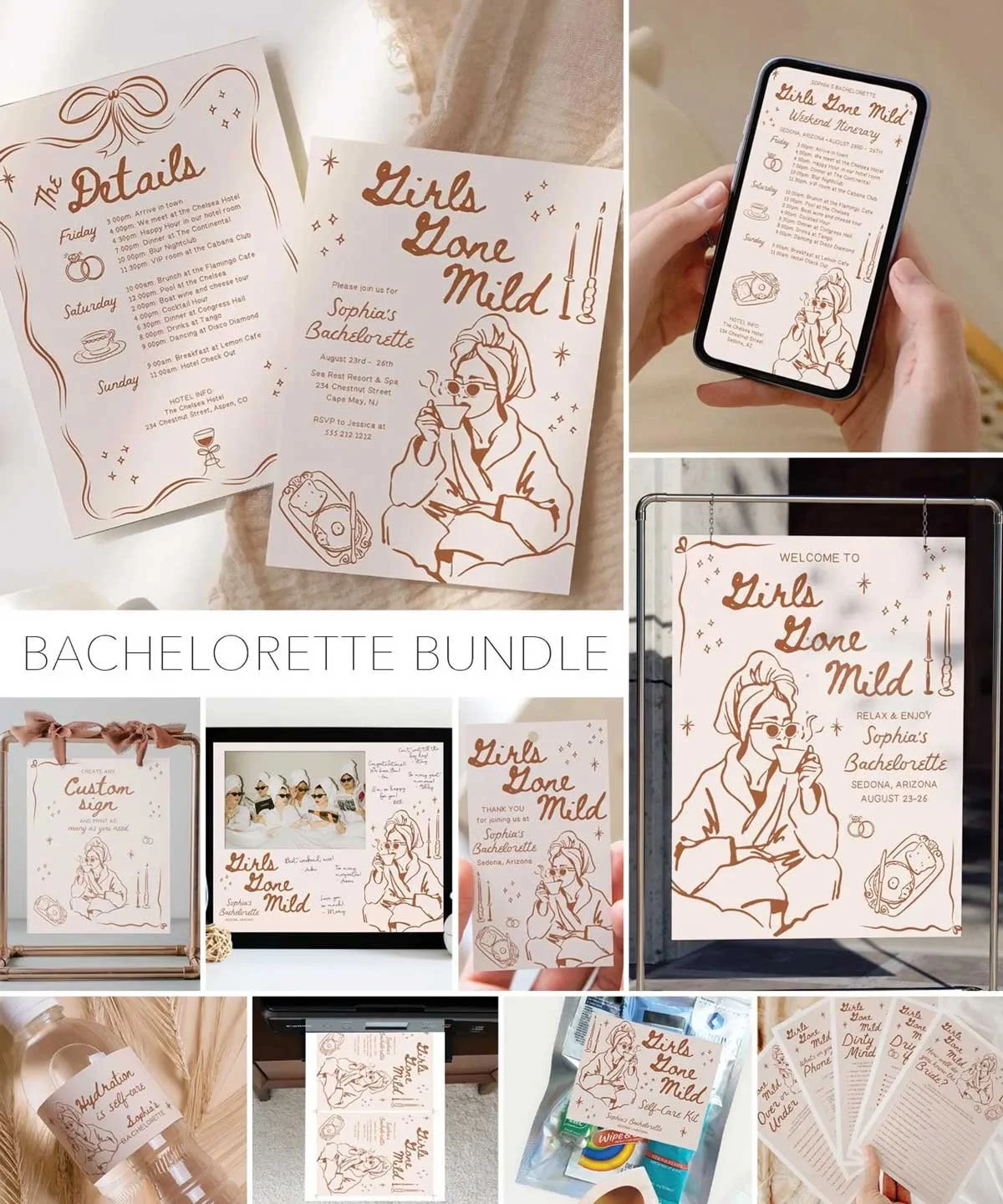 Set the mood for your relaxing bachelorette weekend with this Girls Gone Mild invitation and itinerary template. Easily create this bachelorette party invitation / itinerary on your computer, tablet or phone! Two sizes included: 5x7 & 4x6.