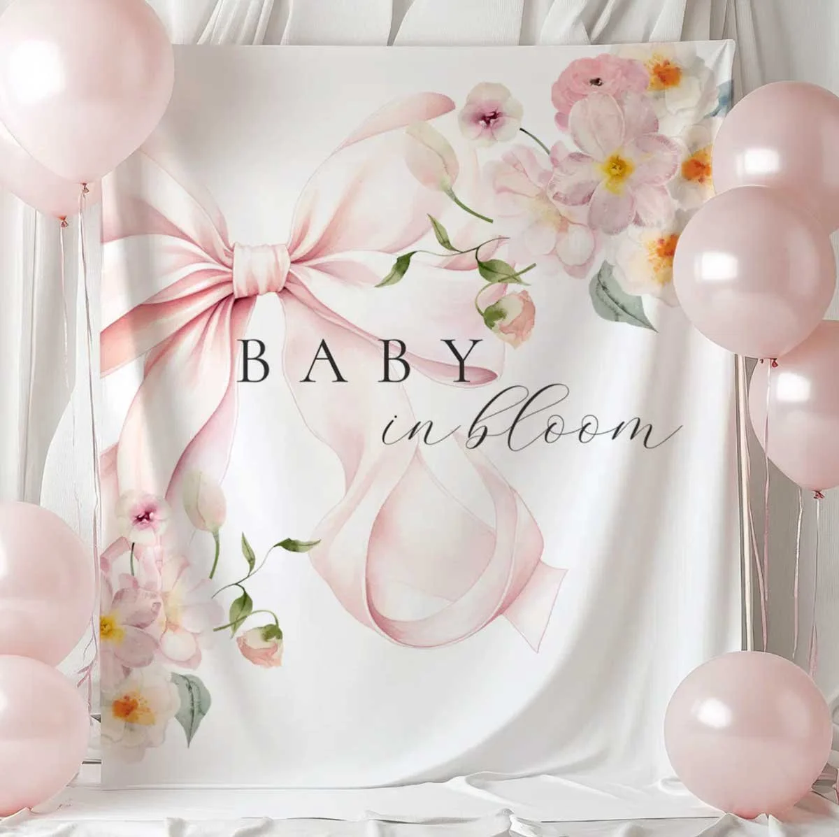 Create a larger baby shower backdrop with a tapestry sign that matches your baby shower theme.