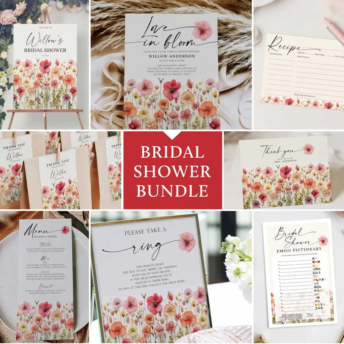 Step into a garden of charm and joy with our “Love in Bloom” wildflower‑bridal‑shower theme, designed to capture the fresh, carefree spirit of spring and early summer. Picture a bridal shower setting with soft wildflowers and delicate pastel accents creating an inviting and cheerful atmosphere. Guests are greeted with a flower‑welcome sign, a flower‑bar station for crafting their own small bouquets, and refreshing botanical drinks under softly lit string lights. With printable invitations, thank‑you tags, and coordinated decor elements curated for this theme, you’ll have everything needed to bring the celebration together effortlessly. Whether hosting an intimate backyard brunch or a bright indoor garden‑style gathering, this wildflower motif combines the beauty of nature with thoughtful details that make the bride‑to‑be feel special. From floral centerpieces to themed favors, every aspect celebrates new beginnings and the joy of friendship and family. Let your bridal shower bloom beautifully—where every petal, color, and detail reflects the lively spirit of “Love in Bloom.”